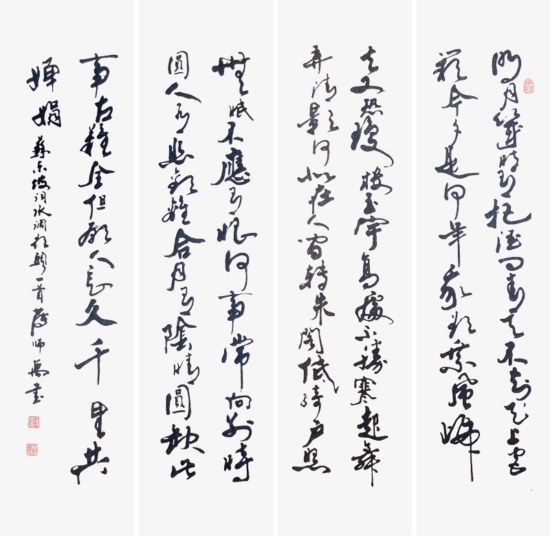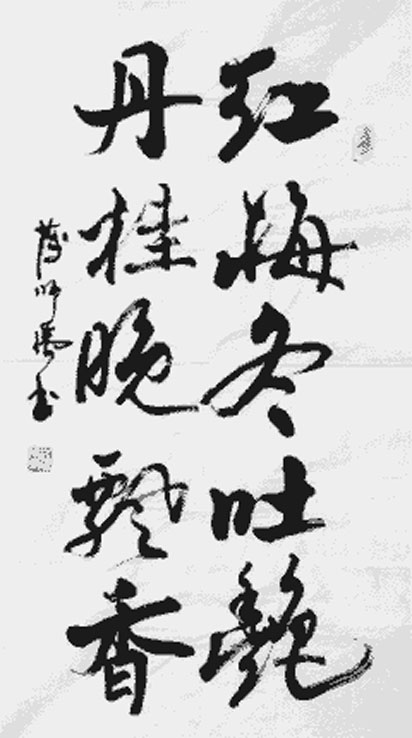 这固然不是对书法艺术推确而完整的把据,也不足以代表薄师禹砚耕多载,独具风貌的艺术境界。但薄师禹的书法硬是以阳刚之美作为审美取向的,这是宽厚性格、坚毅个性的书法中最为直观的体现,书学上常讲,“有功无性,神采不生;有性无功,神采不实”,薄师禹是关中大汉,平和淳厚,质朴正直,嗜书如癖而又不作奇弄怪,书艺和性格有机地结合在一起,相得益彰。因而他的书法作品笔力强劲,气势纵逸,以中缝行笔,明快爽骏,起锋收笔,自然大方,转折萦带处尤见功夫,干净利索,无拖泥带水,尖刻油滑之病,擒纵提按,大起大落,气势完足,有一种“思如泉而吐风,笔为海而吞鲸”的风采。