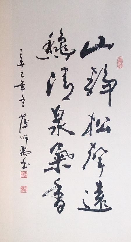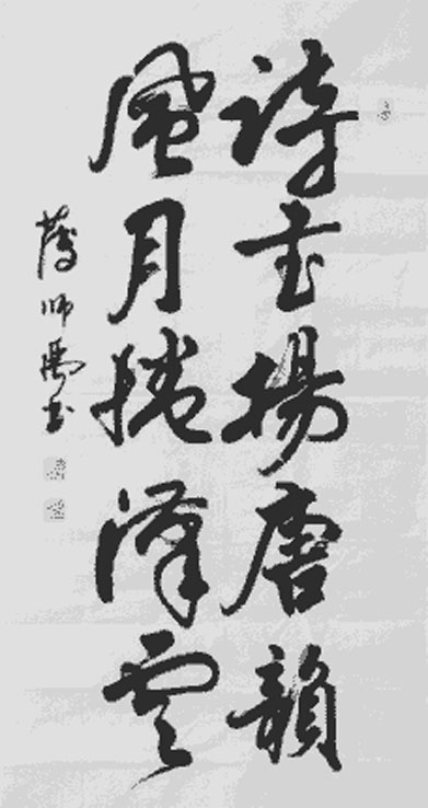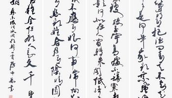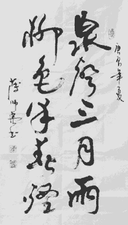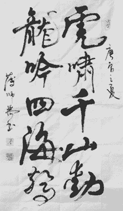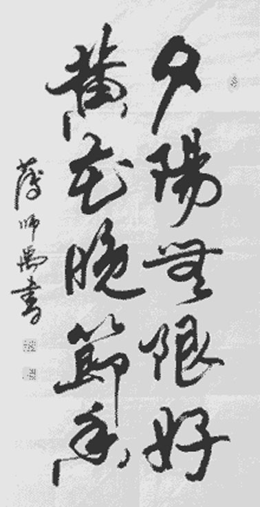 “心为物役"是一种感觉,也是一种境界。能使心灵受到感染的艺术一定是极具震憾力的。这种震撼力也是极富美学色彩的。欣赏薄师禹的书法作品时,这种感觉尤为强烈,那力透纸背的激情意识,那种在继承与突破的矛盾中呈现的狷介气质,那明快而富有层次神韵的笔痕墨迹,虽没有柱天之峰的昂扬或大河奔流的姿肆,却以探入自然本质力量的感受使艺术直驱人生化境。有一种如燕赵之士慷慨悲歌,关中大汉弹铗长啸,气势恢弘广远而烟云苍茫无际的境界,使我不由得想起明末大儒王渔洋对书法取势的论断“烟墨淋漓元气足,老笔纵横破边幅”。斯情斯景,正和斯意。
