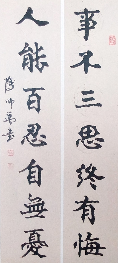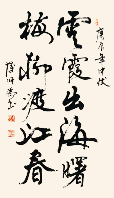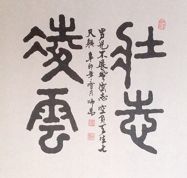 薄师禹浸淫书道三十余年,从唐楷人手、杂糅诸家,博取众长,对北魏碑贴有着独特的理解和参悟,因而他摒弃圆滑侧媚的书艺,推崇和临习的都是高韵古风,逐渐也视染了达观健朗的郁勃之气,送笔抒墨板具张力,全神贯注,激情飞越,落笔迅捷,点画精到,线条浑劲而有力,韵致流畅而庄重。笔兴畅发时,只注意性情的喷发,无章于书体的工拙,也无心提笔蘸墨,而是纵笔豪放,,任情姿性,时有渴笔,飞白满纸。书势纵横开合,跌宕而起伏。具有强烈的跳跃感,他巨笔书就的牌匾题额尤见功底,在验绝处复归平正,在平正中追求险绝,宾主相顾,起伏相承,疏取神韵,密取浑健,纵横取势,沉雄峭拔,热烈奔放,雄强肆张中淋满尽致地表达出恢弘开张的心态和宽厚挺拔的性格。